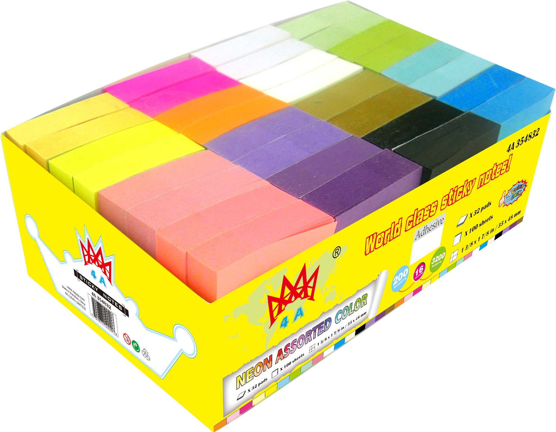/ 4A Sticky Notes,1 3/8 x 1 7/8 Inches,Small Size,The Adhesive On Longer Side,Neon Assorted,Self-Stick Notes,16 Colors,100 Sheets/Pad,32 Pads/Pack,4A 354832
